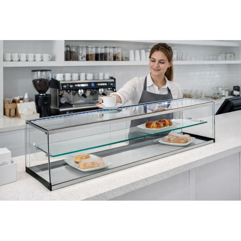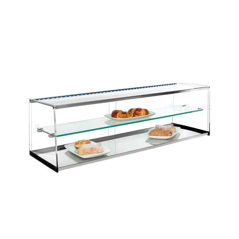 Quick view CHILLED DISPLAY CASE R iE €1,280.00 Add to cart wishlist compare Availability: 3 In Stock LED lighting. Methacrylate sliding doors. Black curved glass decoration. Tempered safety glass. Intermediate shelf. Includes 1,5/2/3/4 Grills.